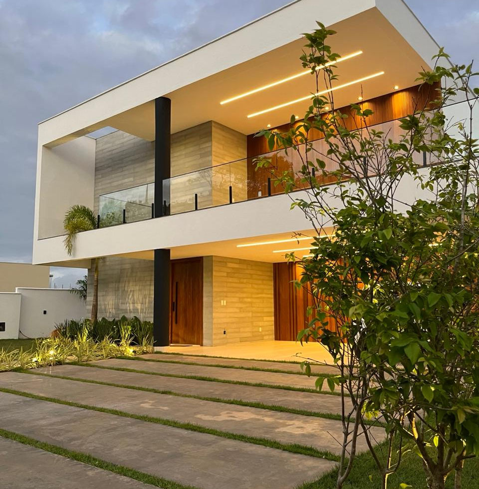 Fachada contemporânea marcada pelo jogo de volumes e balanços que conferem leveza à composição. Os planos claros dialogam com a madeira, criando contraste e aquecimento visual, enquanto a iluminação valoriza a arquitetura de forma sutil e sofisticada.